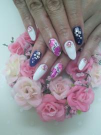 ネイビーと白の全塗りにフラワーアートとストーンアートをいたしました(*^^*)