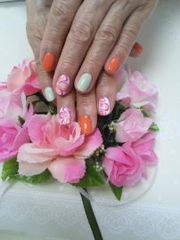 ピンク、グリーン、白の逆フレンチにラメラインとストーンを乗せて
