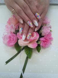 ベージュ、白の逆フレンチにポイントでタイダイアートとストーンを乗せました(*^^*)