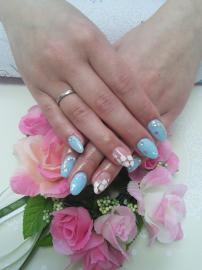 水色の全塗りに白ラメとポイントでフラワーアートをして