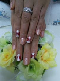 赤と白の逆フレンチにチェック柄とホロアートをして