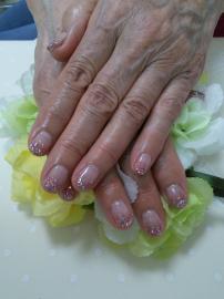ピンクベージュのフレンチにラメライン&