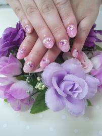 ピンクの全塗りにストーンアートと
