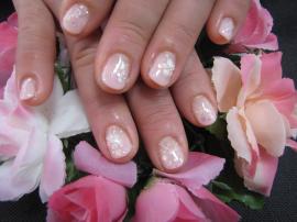本日はピンクベージュ系のカラーで逆フレンチスタイルにラメのラインとストーンをのせて、
